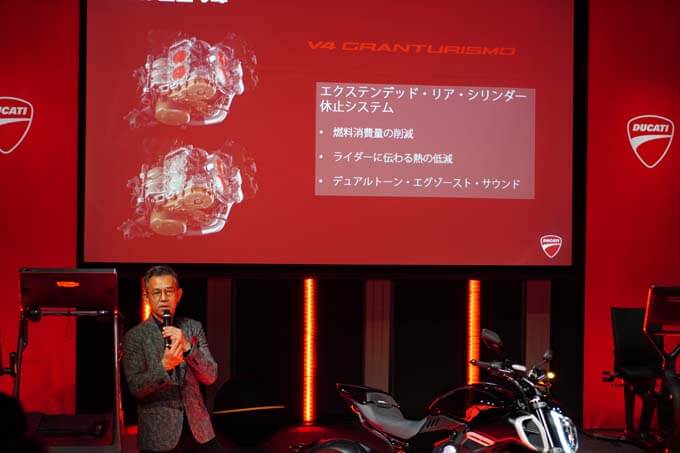 80~90年代にかけて数々のレースで輝かしい戦歴を残し、MotoGPの解説者などとしても知られている宮城光さんは、ドゥカティのアンバサダーも務めている。その宮城さんが新型ディアベルV4の解説を行った。