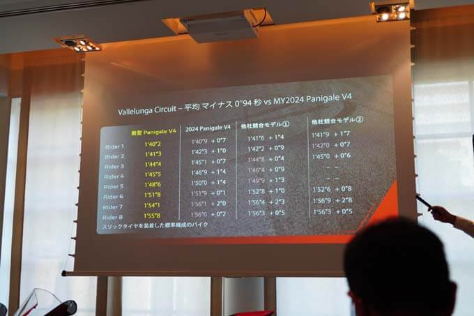 新型パニガーレV4に乗れば、どのようなスキルのライダーでもラップタイムを縮めることができるという説明がされた。パワフルであることだけでなくライダーの意思に対し従順に走ることこそがポイントとなっている。