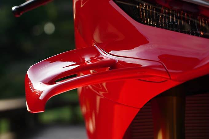 サイドカウルに上下ふたつに分けられたスリットは、ラジエーター、オイルクーラーに受けた風の出口となっている。風(空気)の動きの見直しも新型パニガーレV4の大きなポイントだ。