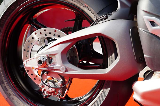 『Easier to Faster』。つまり、より簡単により速く。明確であるこの目的を果たすために手を加えたことは多岐に渡るものだが、新型パニガーレV4を見て、多くの人が注目したのはスイングアームが両持ちタイプとなったことだろう。しかも実物を見るとかなり肉抜きがされており、それは耐久性すら心配になってしまうほどだ。なお外観上は見えない部分であるがメインフレームのフロント周りも肉薄であり、ハードブレーキング時にフロントタイヤ、サスペンション、トリプルツリーと圧し掛かってくる衝撃にどうやって耐えるのか疑問に思える。