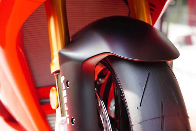 「MotoGPやWSBKでの最大の進化はタイヤにある」これが開発者の意見だ。裏を返せばタイヤの進化に合わせて車体を作らなければならない。新型パニガーレV4で注目すべきはワイド化されたフロントフェンダーにもある。空力特性の最適化だけでなくスリックタイヤも使用できるようにされているのだ。