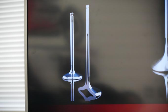 インテークバルブには中空ステムをドゥカティの市販車で初採用している。これにより慣性を5%軽減している。ちなみに今回のエンジンはデスモドロミック機構が廃止されている。