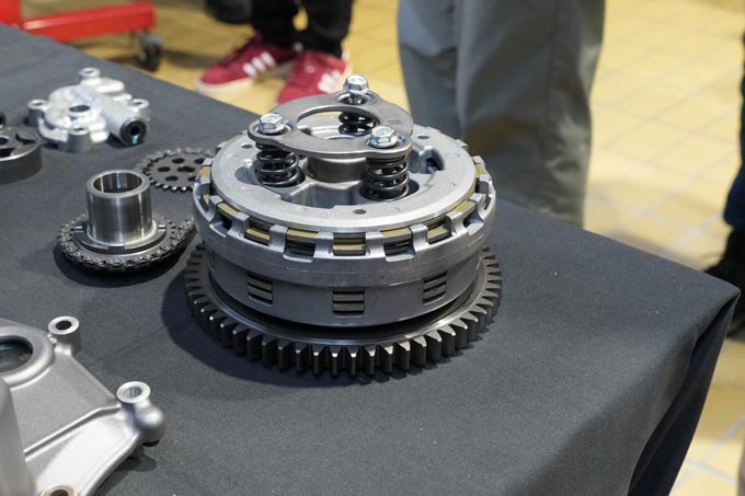 ニューパニガーレV2のクラッチ。従来モデルに採用されていたものも用意してもらい比べてみたところかなりコンパクトになっていた。出力に対してバランスを取りつつ軽量化を図ったポイントの一つ。