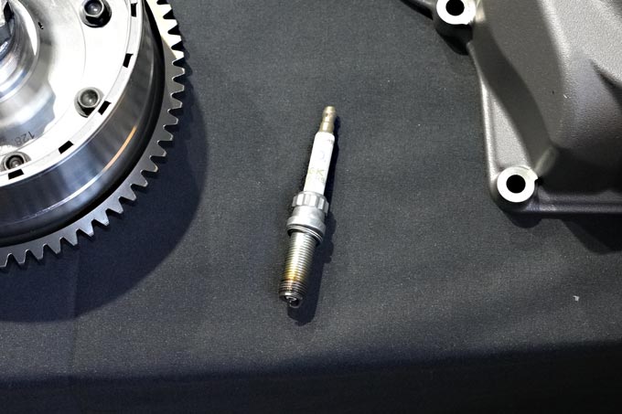 かなり細身のスパークプラグはニューパニガーレV2に搭載される新型エンジン専用設計となっているということ。細部まで徹底したこだわりにより、最高の一台に仕上げられていることが伝わってくる。