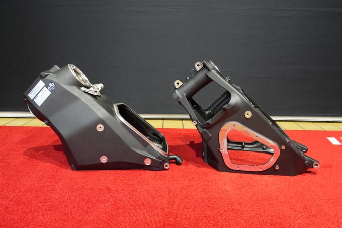 旧型パニガーレ系のメインフレーム(左)とニューパニガーレV2のフレーム(右)を並べてみると、まったくもって作りが違うことが分かる。実際に手で持って重さを比べてみてもその差は歴然だった。