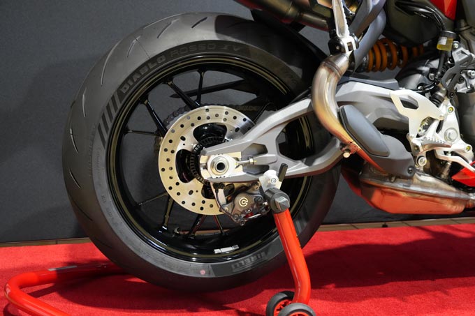 中空構造の鋳造アルミニウム製両持ちスイングアームは、先だって登場した現行パニガーレV4にヒントを得たもの。ケーシー・ストーナーがチャンピオンに輝いた頃のスーパーバイクはガチガチの剛性だったが、それは昔の話となった。