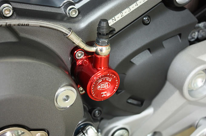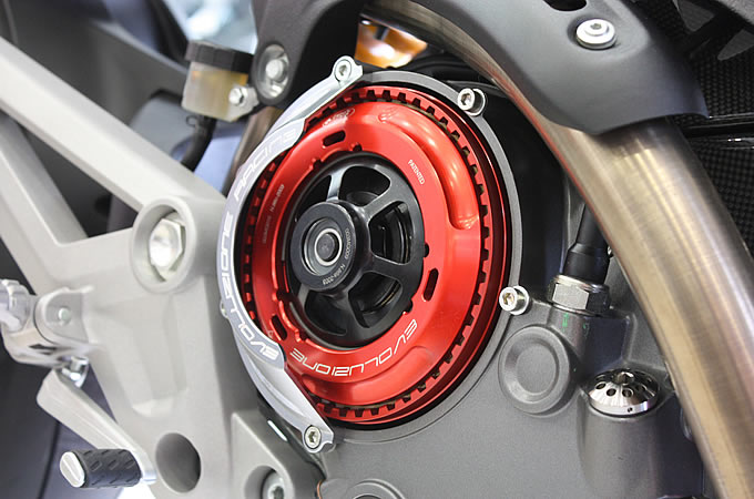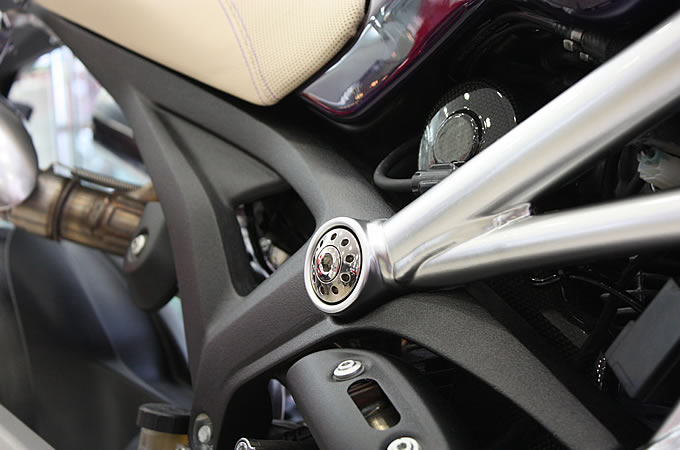 「一番のおすすめは、やはりクラッチレリーズピストンです。ドゥカティは少しクラッチが重いのですが、ここを換えれば随分と軽くなりますよ。メーカーによってはカラーバリエーションが豊富なので、ドレスアップ効果も高いですね。自分が見ている限りでも、ドゥカティユーザーの半数はここを交換しているのでは?というくらい定番です。そして、忘れてはならないのがフレームプラグ。ドゥカティのトレリスフレームの接合部は、ノーマルだとボルトがむき出しなんですよね。ここにプラグをはめ込むだけで、グッとカッコよくなります! リーズナブルな価格で取り付けも簡単ですから、気軽にカスタムできますよ。あと、これはちょっと予算的にオーバーかもしれませんが、スリッパークラッチもおすすめしたいカスタムです。“上級者向け”と思われるかもしれませんが、シフトダウンを安全に行えるだけでなく、ノーマルのクラッチより発進が楽になります。また、エンジンにストレスがかかりにくくなる効果もあるので、長く乗るなら価値あるカスタムになりますよ」